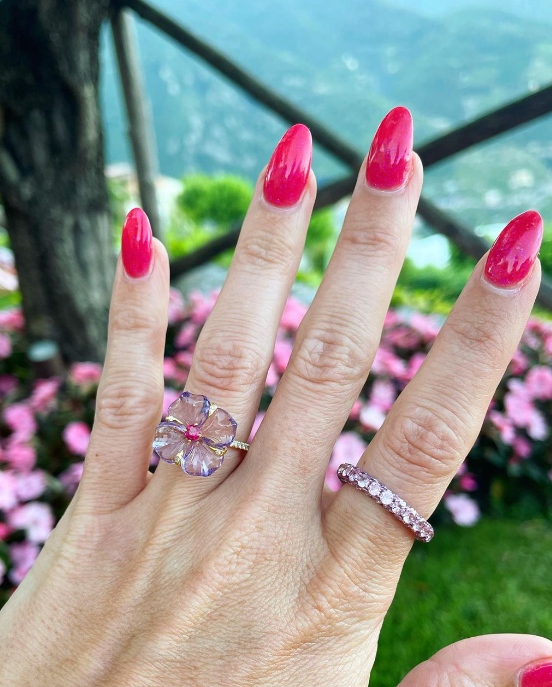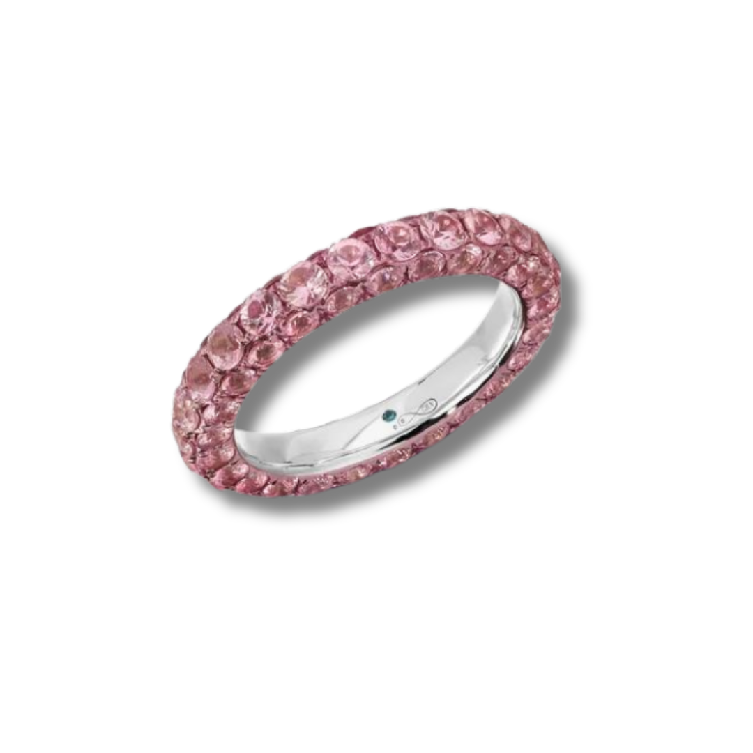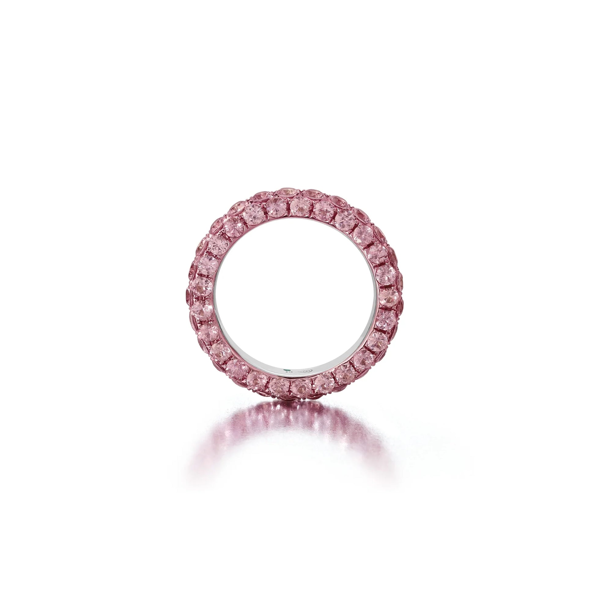 The 3 3-sided pink Sapphire and Rhodium Ring is available in 18K gold with a vibrant pink rhodium. This ring has a total pink sapphire carat weight of 5.00.