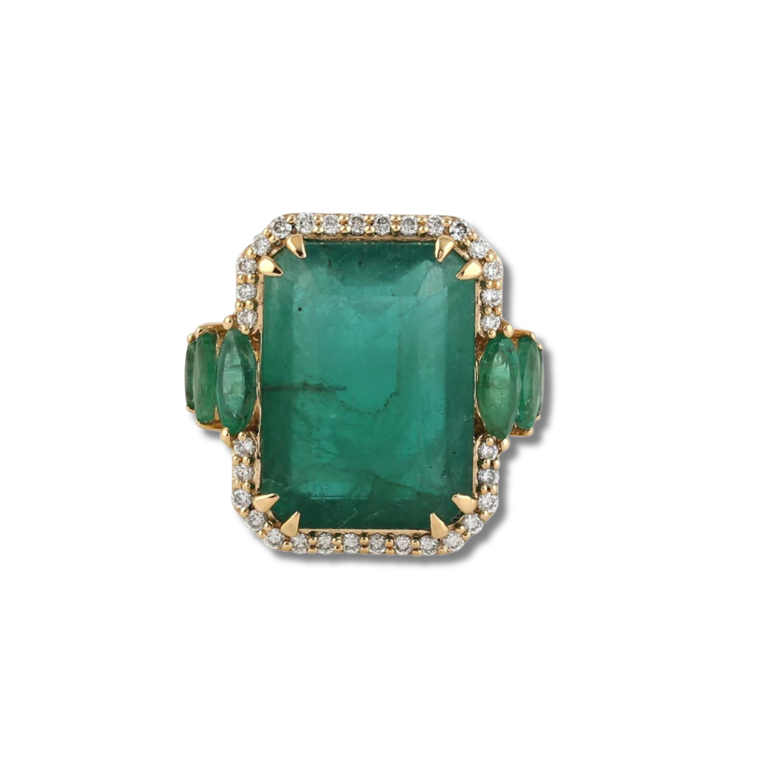 The Bemba Emerald and Diamond Ring is available in 18K yellow gold. This ring has a total diamond carat weight of 0.26 and an emerald carat weight of 11.13.