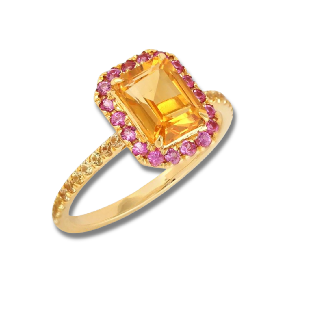 The Citrine and Pink Sapphire Cocktail Ring is available in 18K yellow, rose and white gold. The ring has a total citrine carat weight of 1.73 and a pink sapphire carat weight of 0.69.