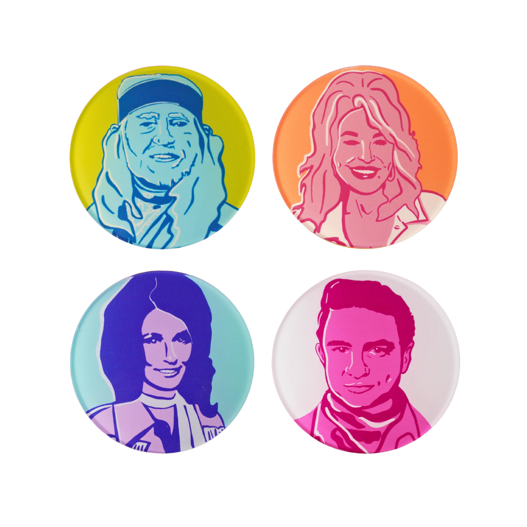 Put some yee-haw into your hosting game with this colorful set of 4 Country Legends coasters! Made with acrylic, these fun and durable coasters feature Dollie, Willie, Loretta and Johnny - four of the biggest and best names in Country Music history! Impress your friends and make your drinks even cooler - these coasters will be the talk of the town (or at least your living room)!