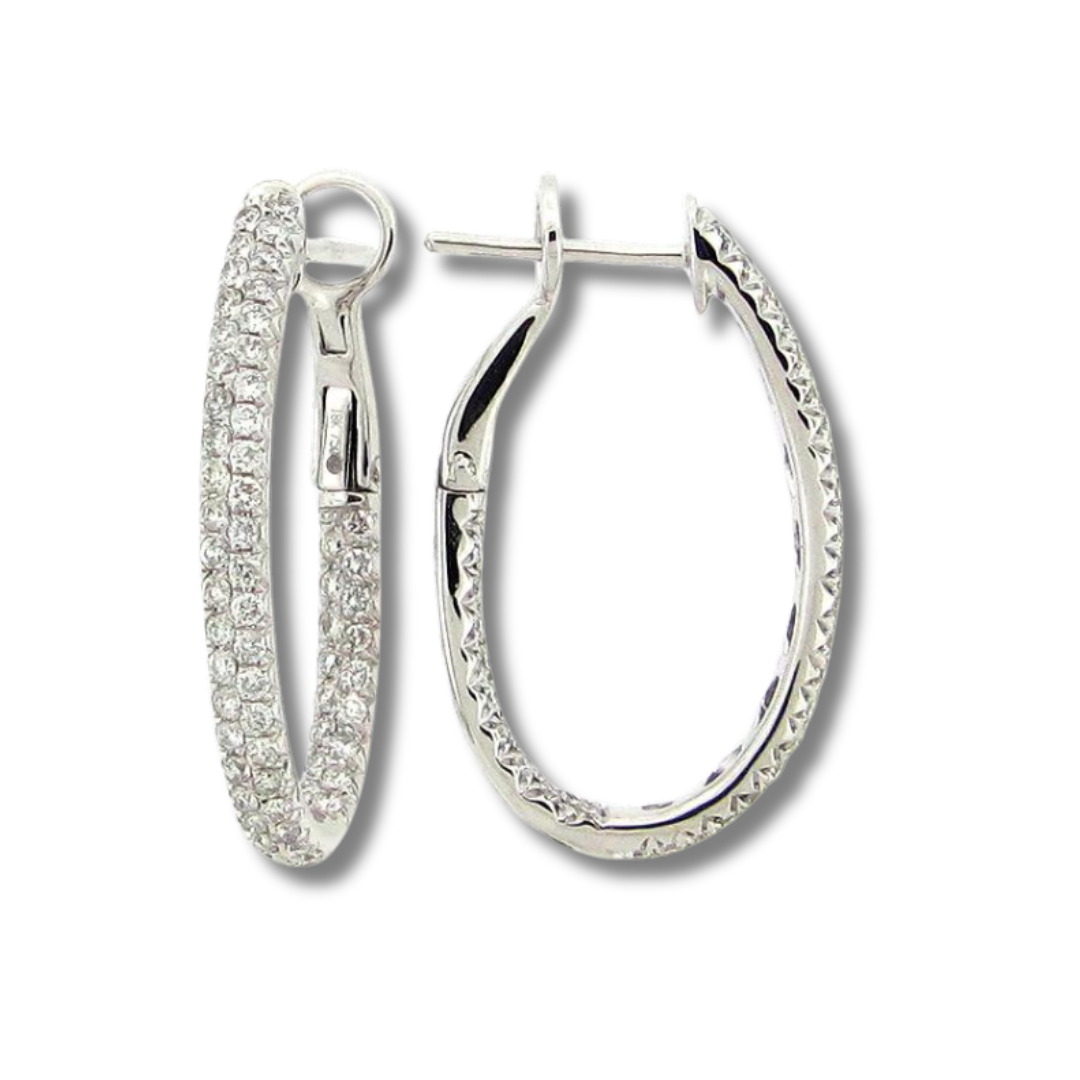 The Diamond 2 Row Oval Hoop Earring is available in 14K white and yellow gold and has a total diamond carat weight of 1.14.