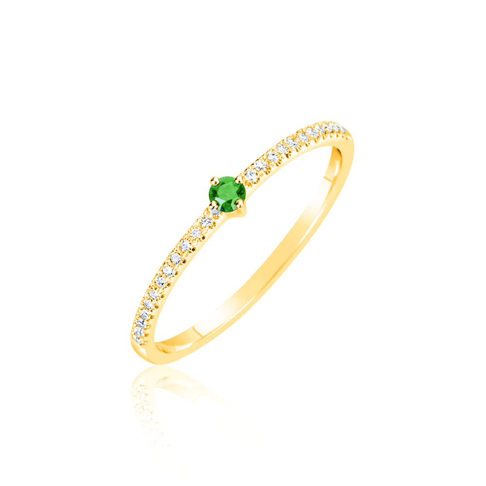 The Diamond and Round Emerald Stacking Ring is available in 14K yellow gold and has a total diamond carat weight of 0.09 with a total emerald carat weight being 0.06.