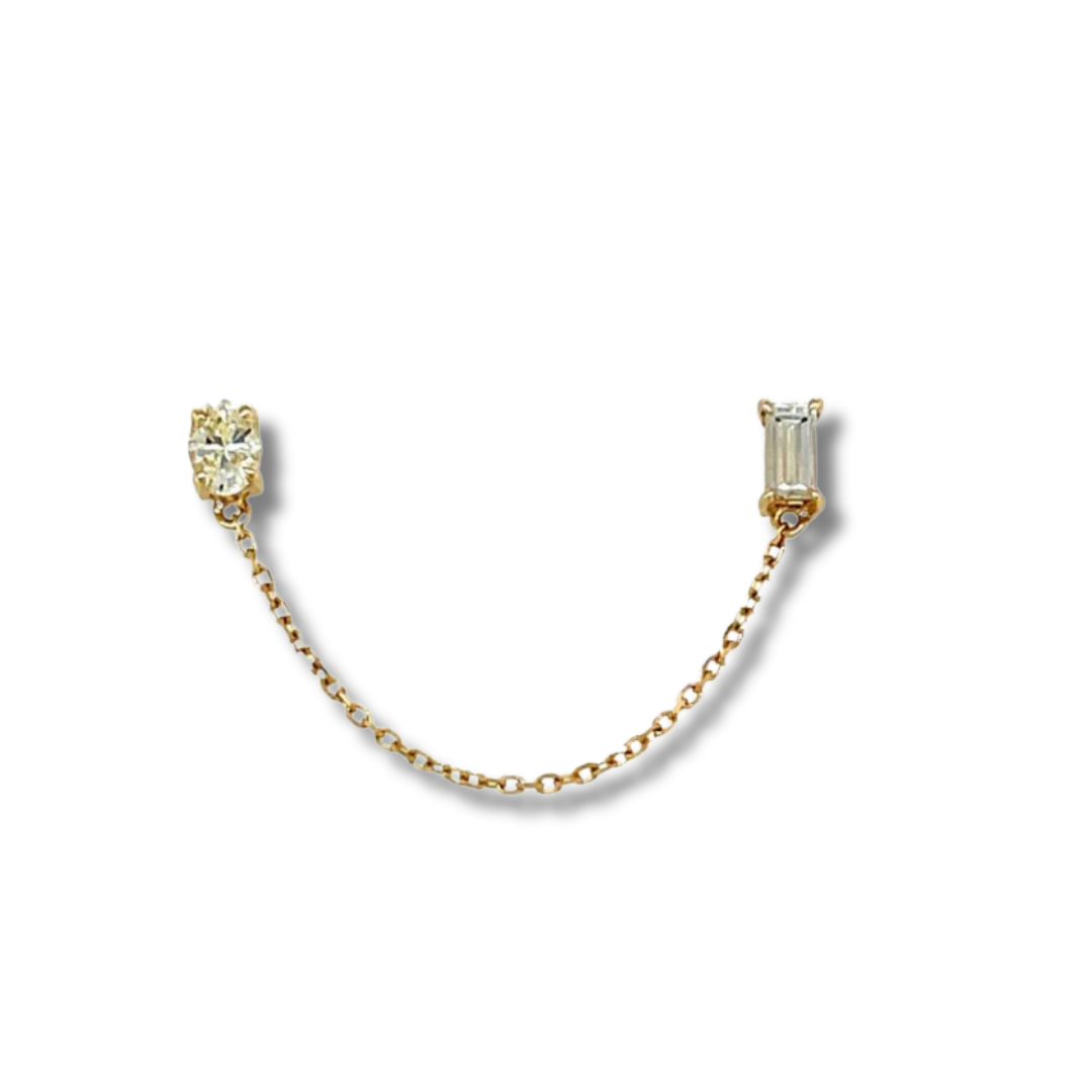 The Emerald and Oval Diamond Chain Earring is available in 14K yellow and white gold with a total diamond carat weight of 0.66.