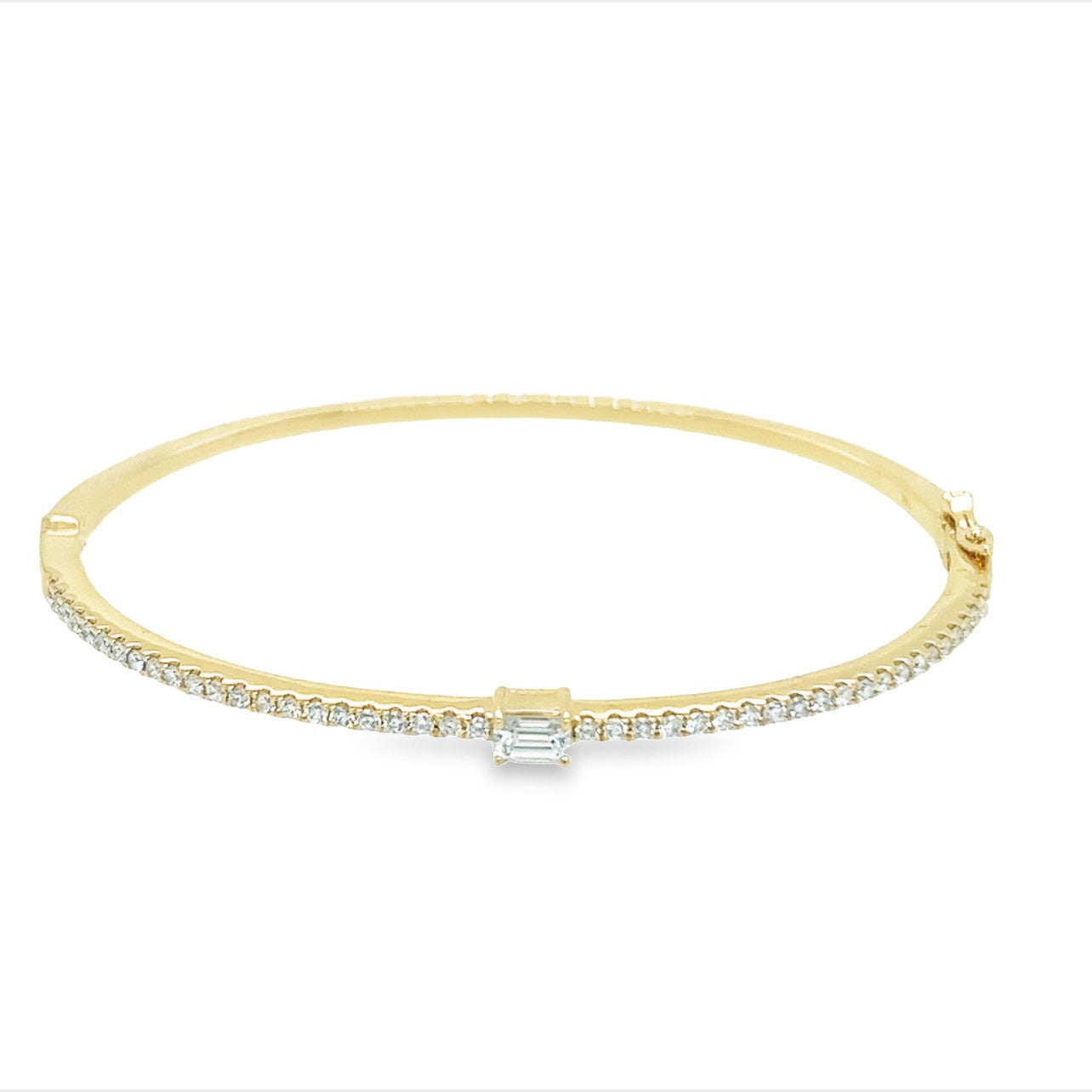 The Emerald Solitaire Diamond Bangle is available in 14K yellow gold with a total diamond carat weight of 0.80.