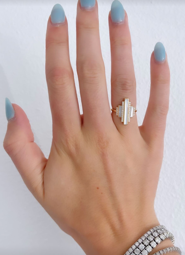 The Fitzgerald Ring is available in 14K yellow gold with a mother of pearl carat weight of 0.21.