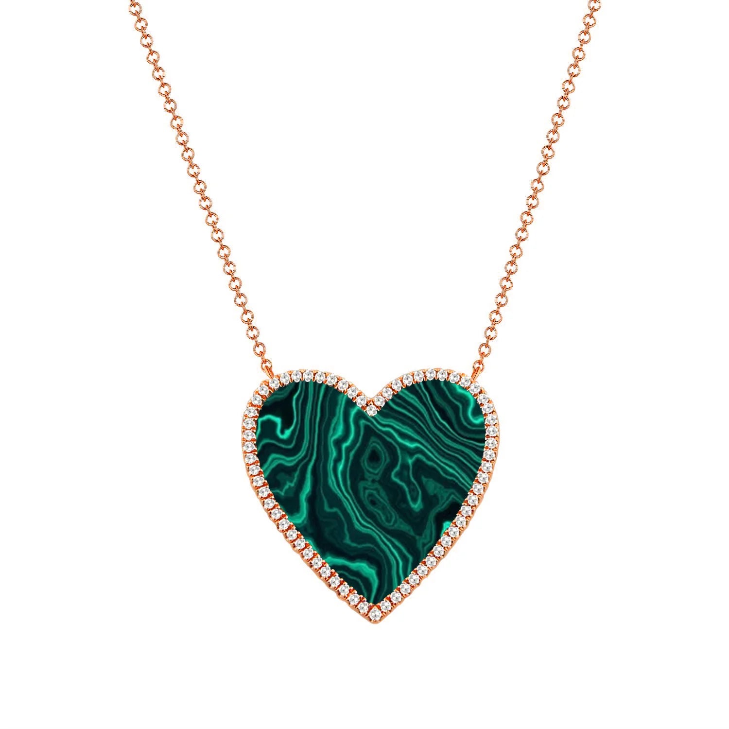 The Malachite and Diamond Heart necklace is available in 14K yellow, white and rose gold and contains a total diamond carat weight of 0.14.