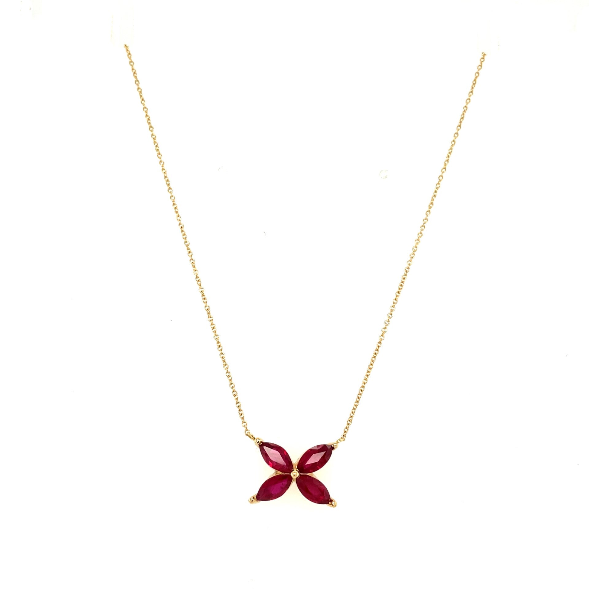 The Maripose Pendant is available in 14K yellow gold with a total ruby carat weight of 1.3.