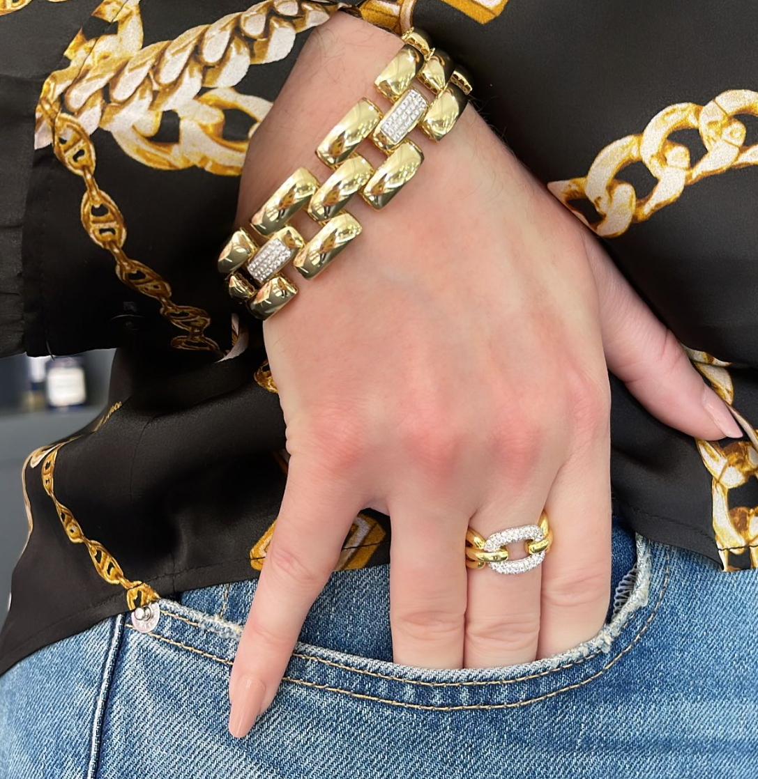 The Open Work Brick and Diamond Bracelet is available in 14K yellow gold with a total diamond carat weight of 0.84.