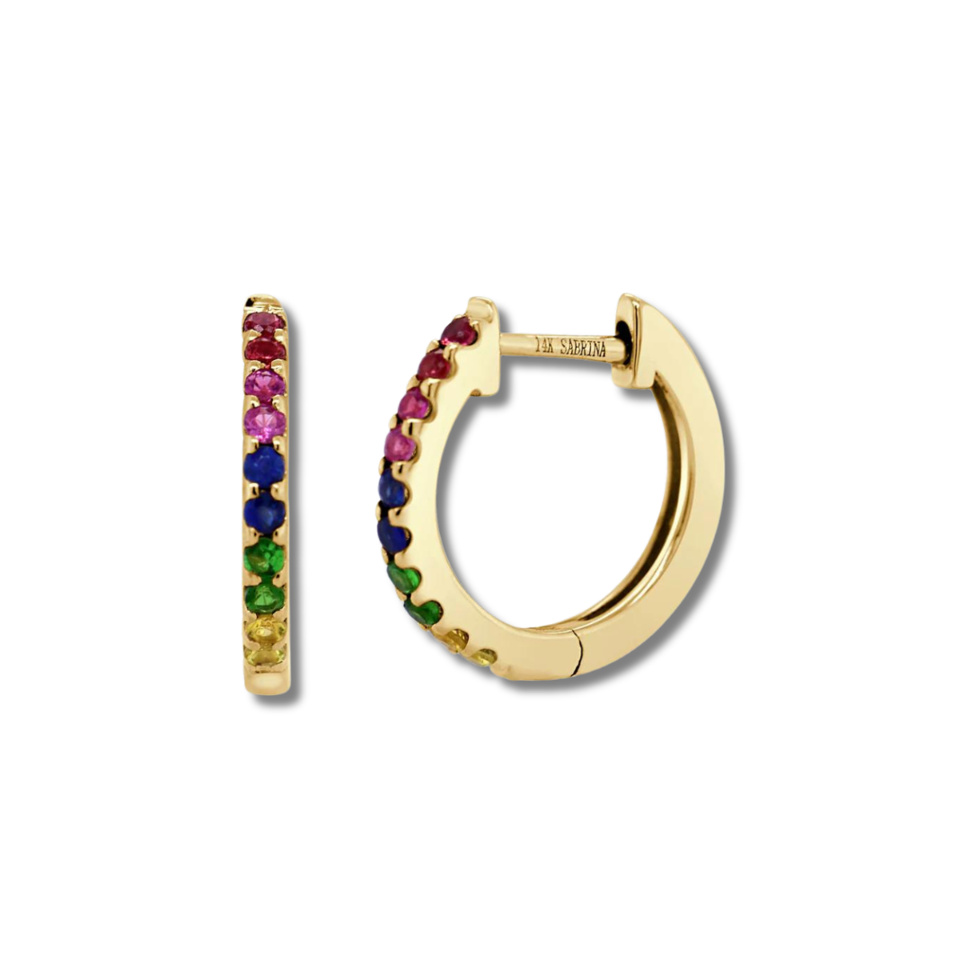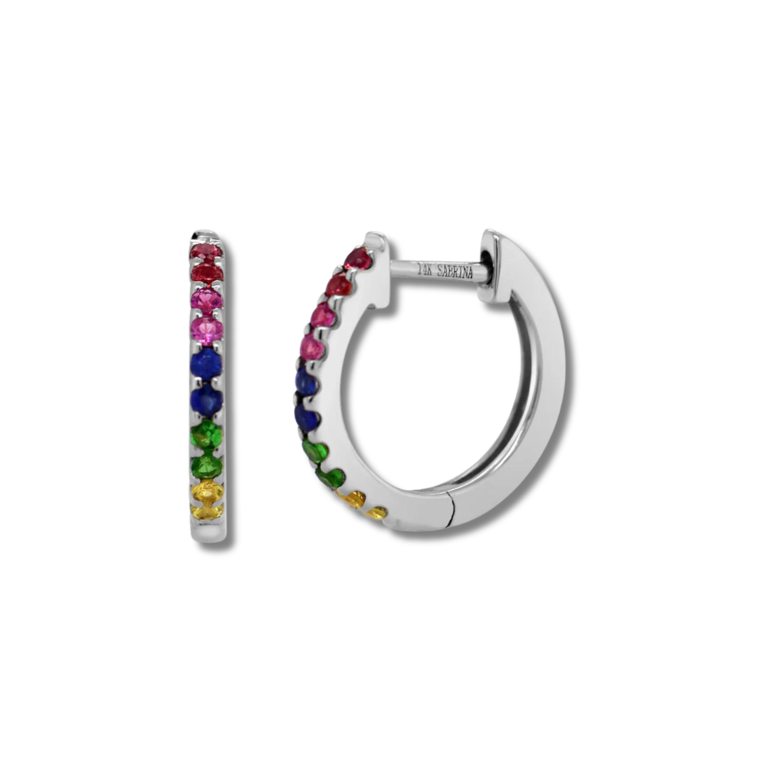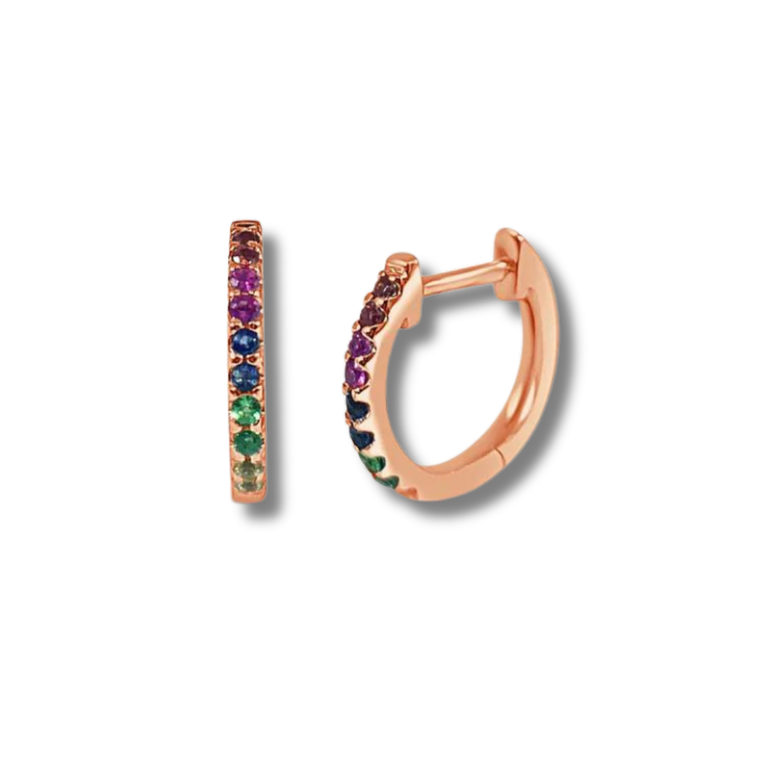 The Rainbow Huggies are available in 14K white, yellow and rose gold