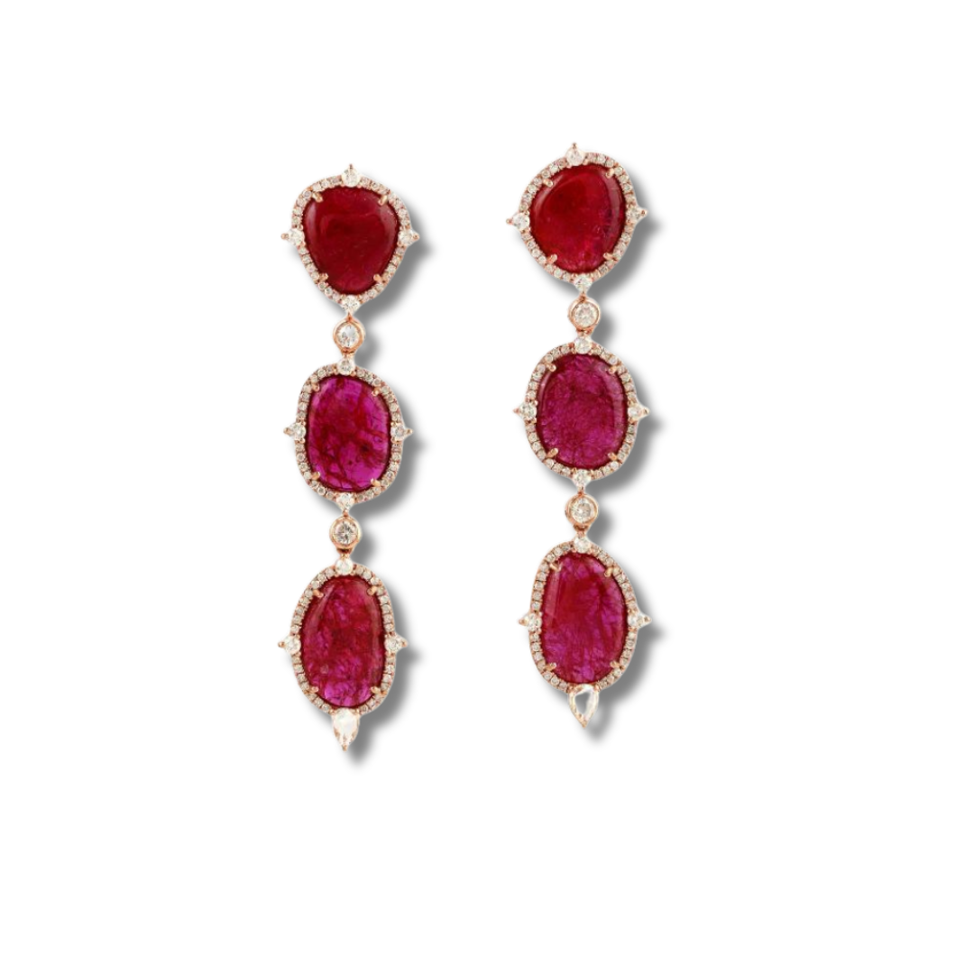 The Samantha Earrings are available in 18K rose gold with a total diamond carat weight of 1.94 and a total ruby carat weight of 21.34.