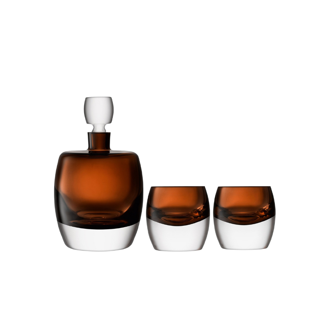 A decanter and pair of tumblers, mouth-blown by master glass blowers from clear and brown glass layers.