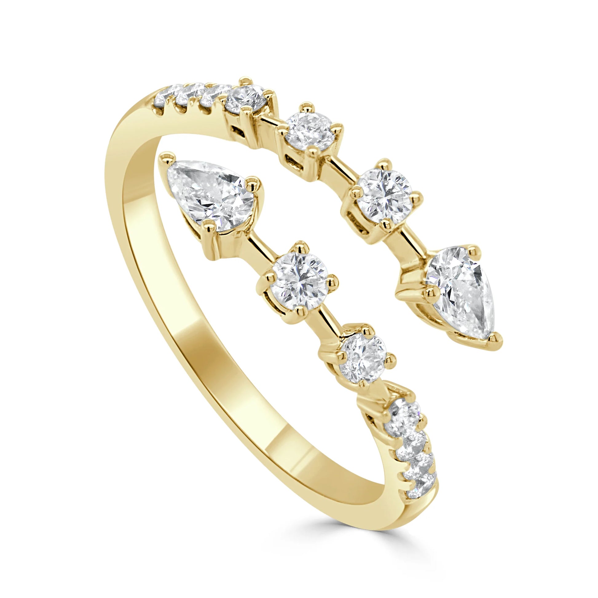 The Round & Pear-Shaped Wrap-Around Ring is available in 14K yellow, white and rose gold with a total diamond carat weight of 0.49.